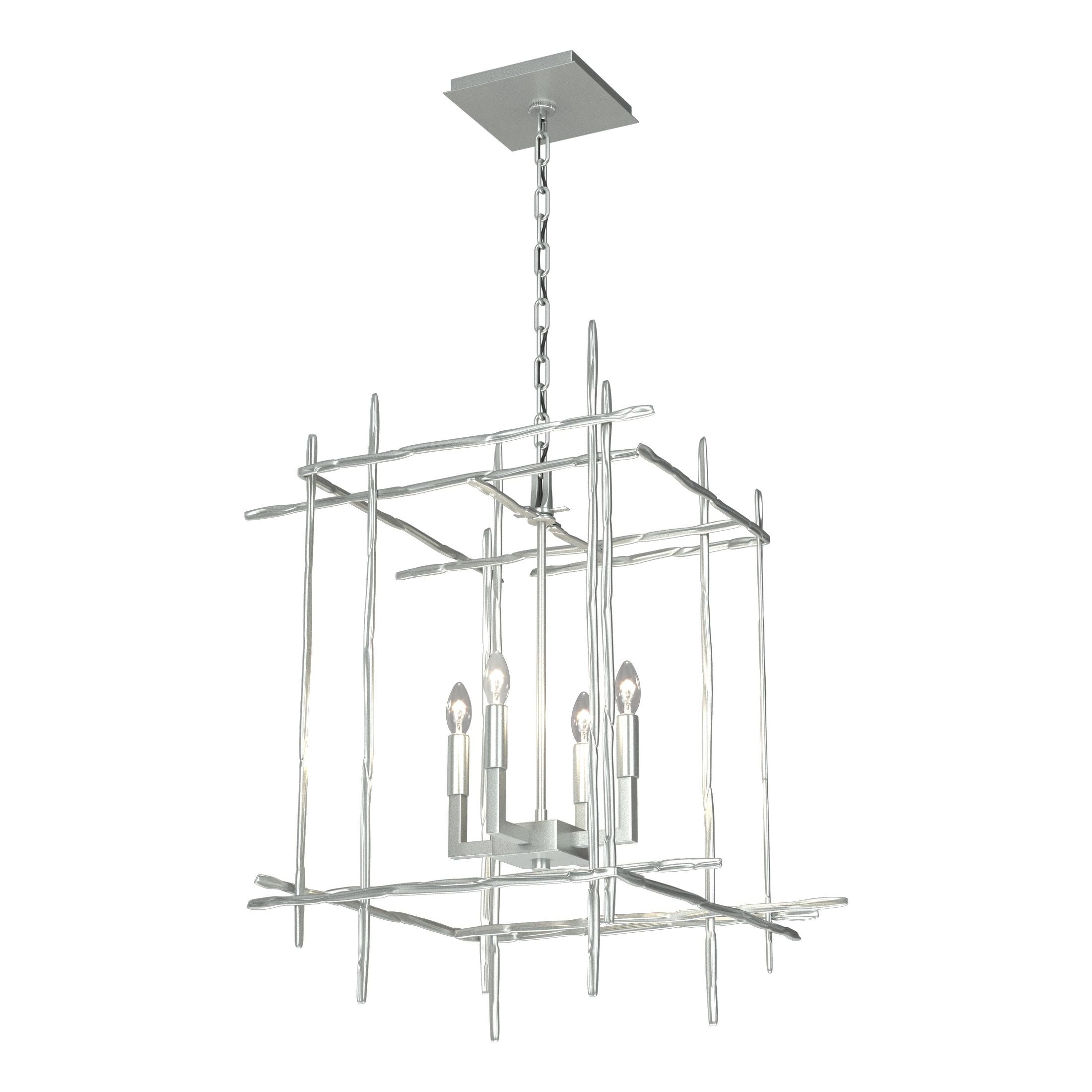 An impressive mid-sized hanging fixture, the Tura 4-Light Medium Pendant features hammered aluminum pieces that intersect at perpendicular angles to create an open cage-like structure that holds 4 Candelabra bulbs within. A versatile size that is perfect for breakfast nooks, as a duo over a kitchen island, in a hallway or in any gathering space.