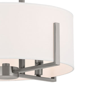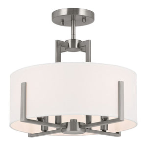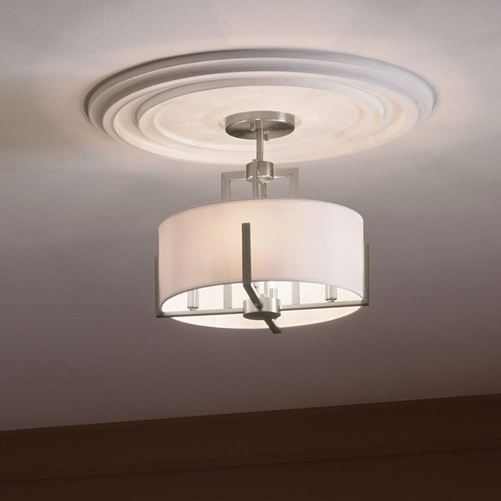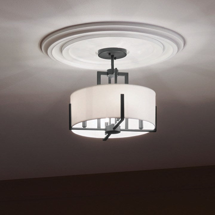 Inspired by the notion of holding and resting, the Malen semi-flush is sheer elegance. Its fabric shade nestles into refined black metal uprights. Its open view from below keeps the bulbs subtly visible as they illuminate your space.