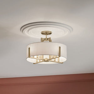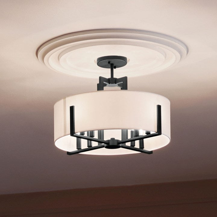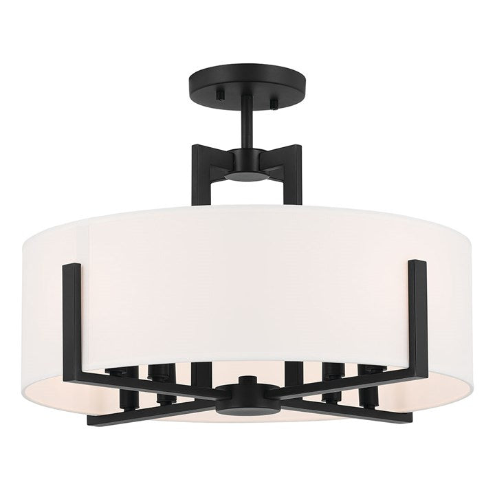 Inspired by the notion of holding and resting, the Malen semi-flush is sheer elegance. Its fabric shade nestles into refined black metal uprights. Its open view from below keeps the bulbs subtly visible as they illuminate your space.