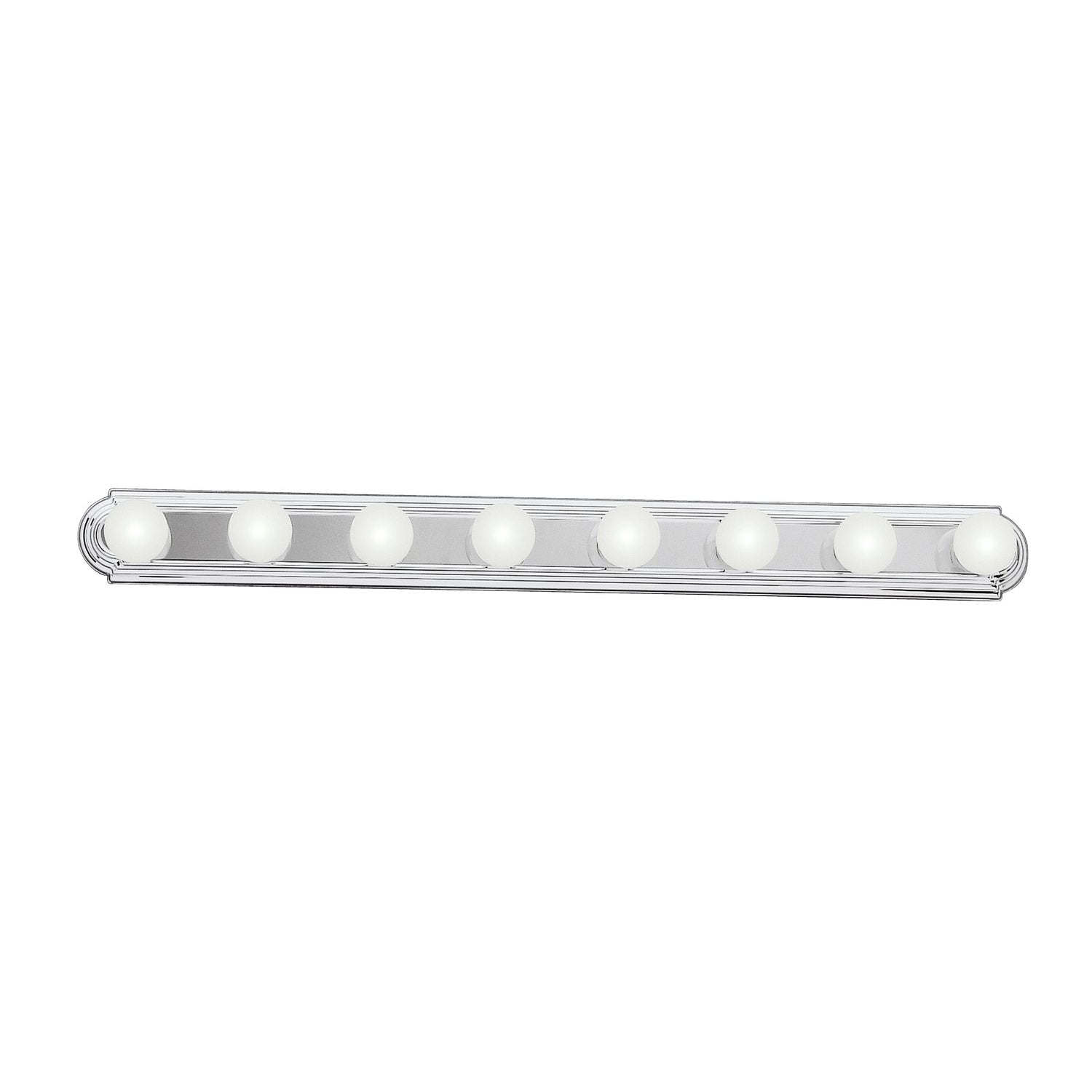 The sleek design of this 8 light bath bar means it fits neatly in many decors and spaces. Chrome finish with 8 white globes.