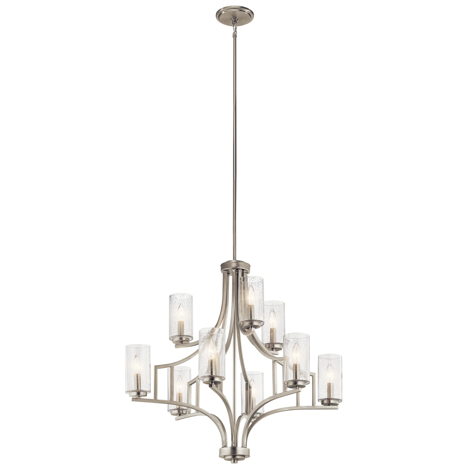 A popular mission fixture gets the designer touch with the 9-light chandelier in Distressed Black from the Vara collection. The sturdy ironwork supports feature linear detailing and the glass shades have a seeded effect, helping to soften the overall traditional masculine look.