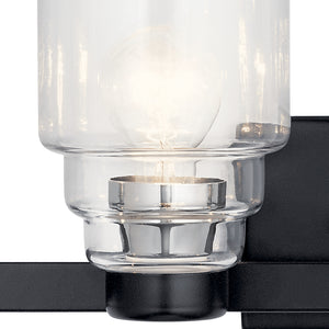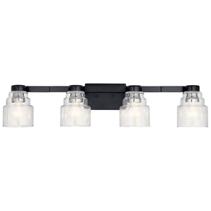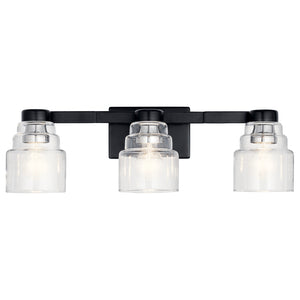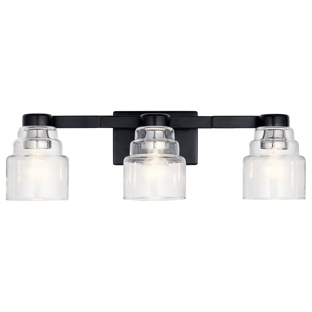 The Vionnet(TM) 24in. 3 light vanity light features a contemporary design in Black and satin etched glass. A perfect addition in several aesthetic environments including contemporary and transitional.