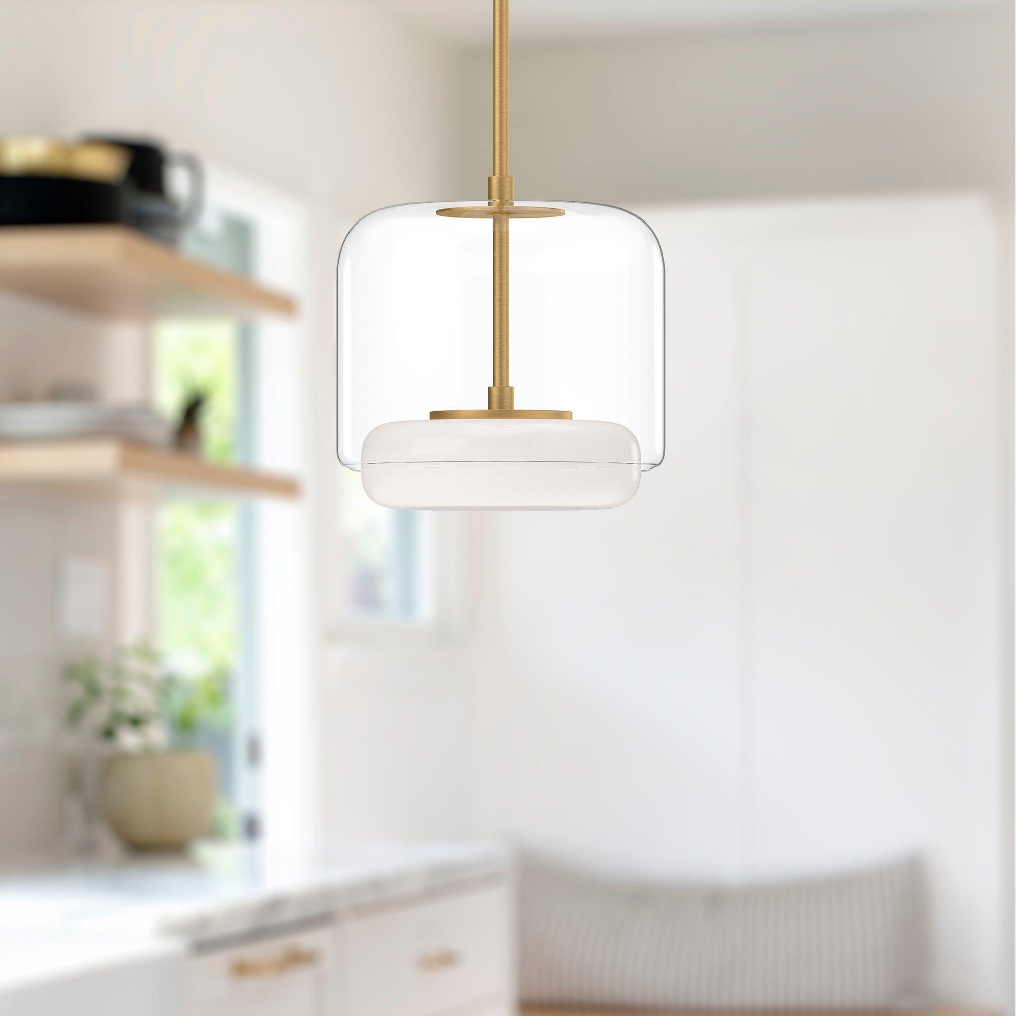 Complementary intersecting glass shapes and contrasting finishes define this elegant fixture. The LED light is centered within a soft opal glass diffuser that is enveloped by a larger transparent glass shade. The outer glass shade is available in Smoked or Clear and may be combined with either Brushed Nickel or Vintage Brass metal finishes.