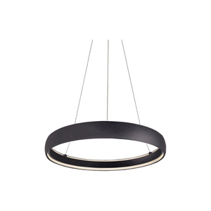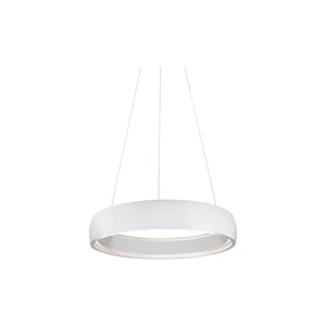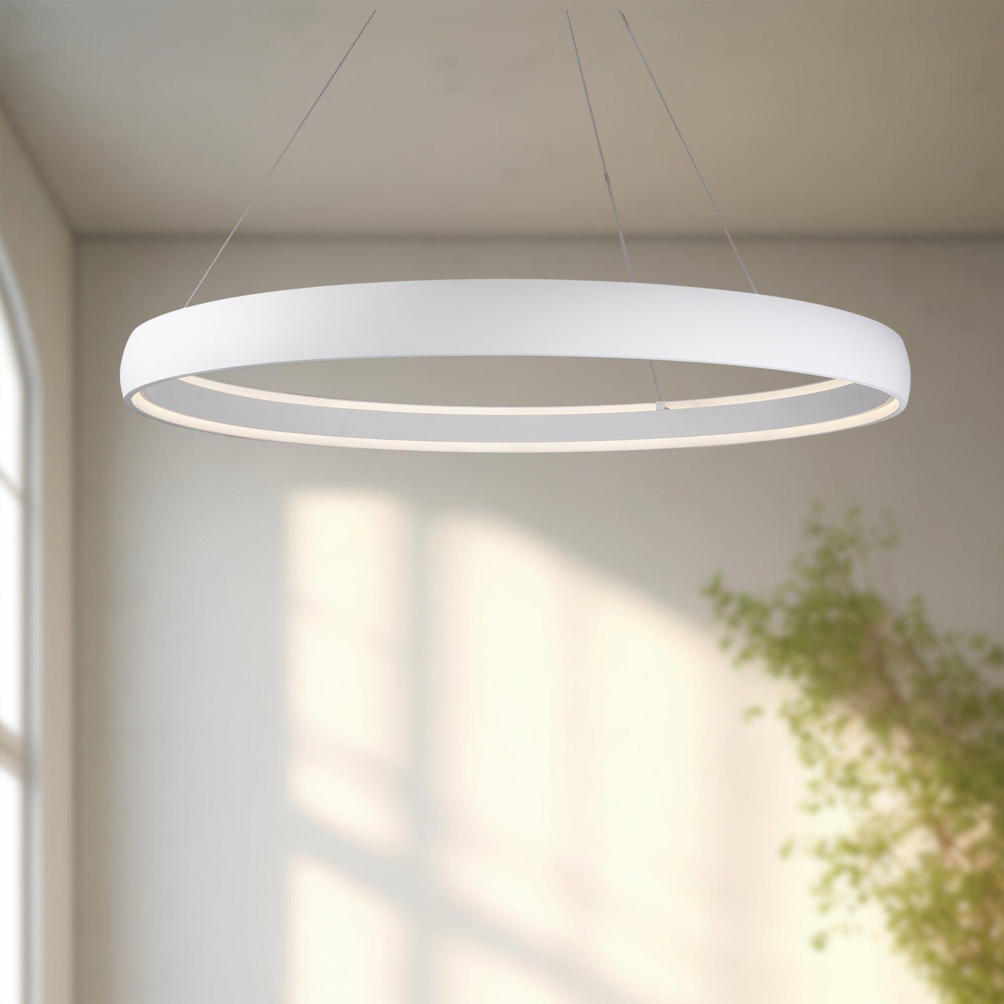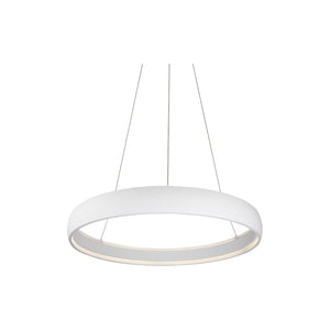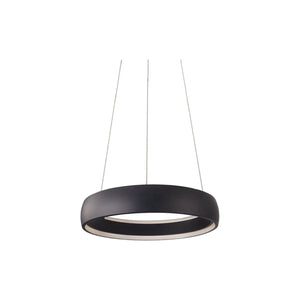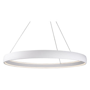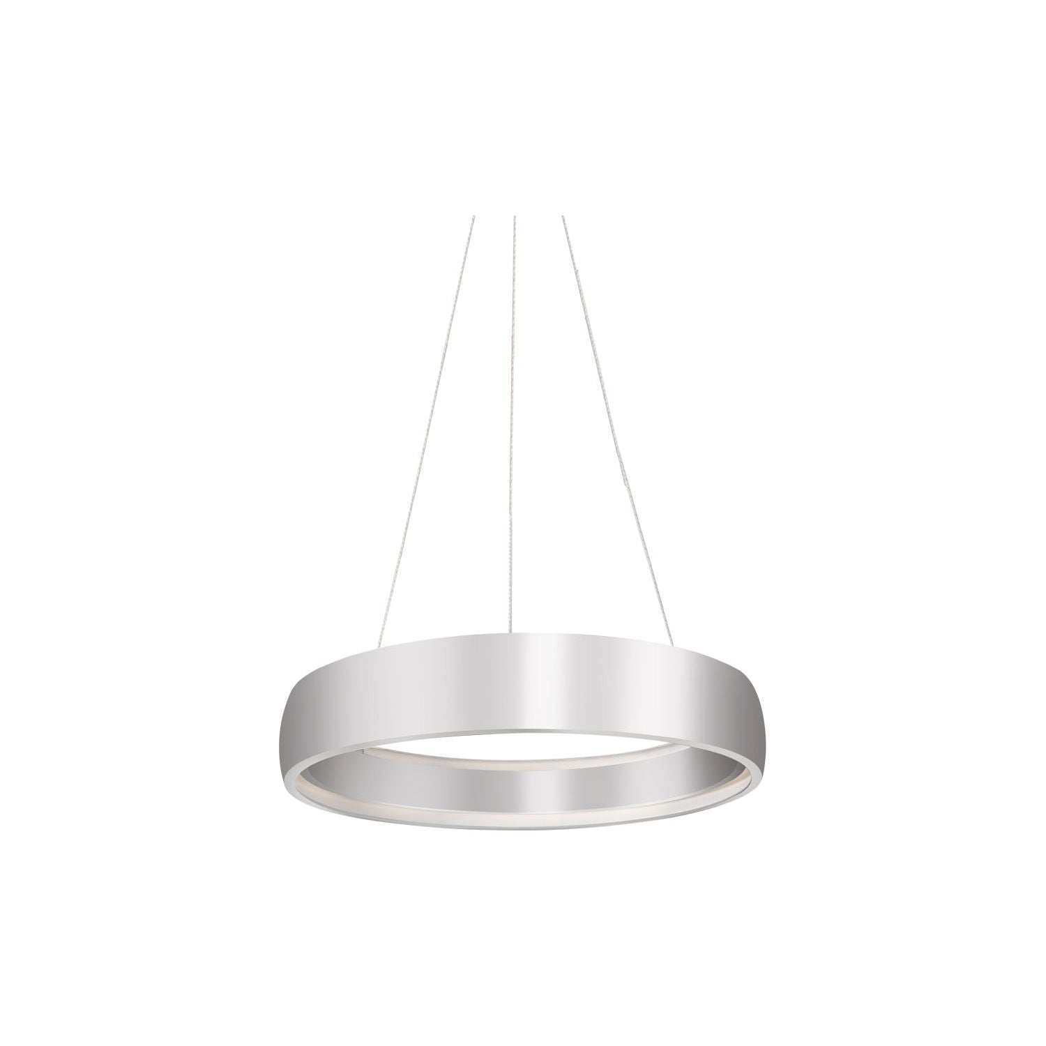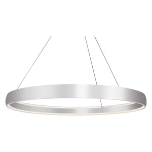 Aircraft cable suspended circular pendant with circular canopy. Soft up/down light is emitted from LED arrays and diffuser concealed within the ring - a design which seems to almost hover within your space. A gentle curve to the disk’s external surface adds to the minimal appearance of the design. The second in a series of four sizes.