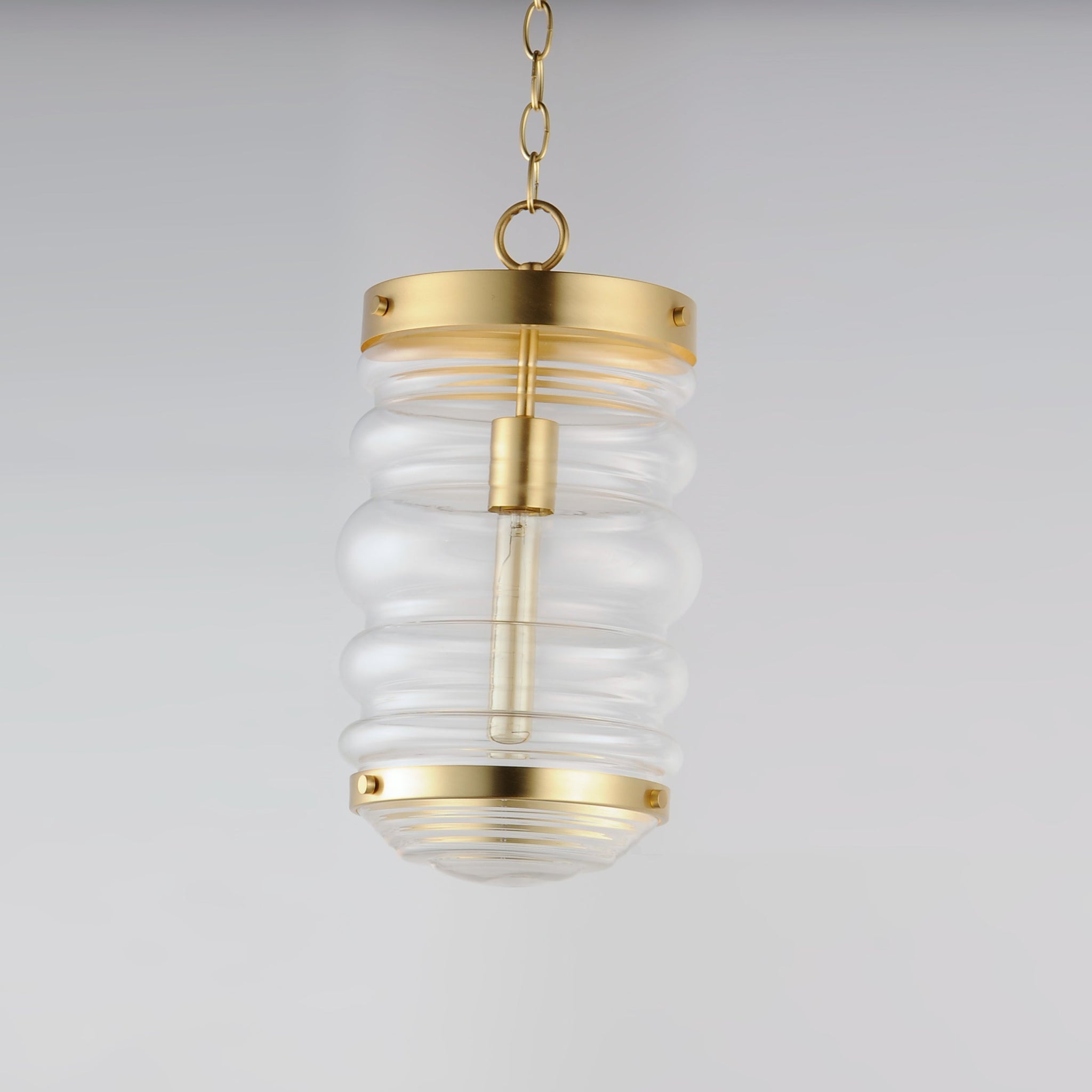 An oversized oscillating, cylinder of Clear Seedy glass adds to a variety of coastal inspired pendants. Three knurled edge set screws support a massive glass with a ribbed bottom. Pair the clear glass shades with tubular filament lamps to complete the look.